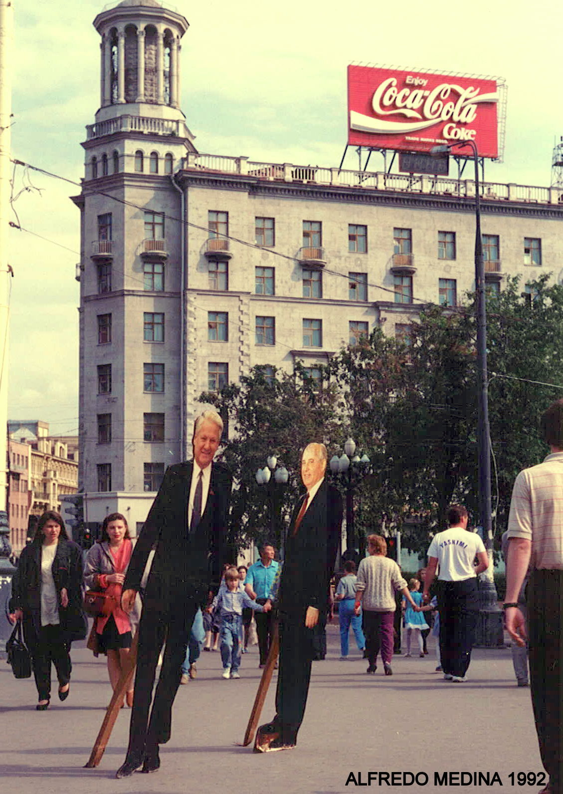 JULIO 1992. Siete meses después de la disolución de la Unión Soviética un gran letrero con el símbolo más universal del capitalismo preside la plaza Pushkin. A sus pies las figuras de dos presidentes: Yeltsin,primer mandatario de la nueva Rusia y Gorbachov , el último máximo dirigente de la vieja Unión Soviética . Convertidos aquí en simples figuras de cartón, estos políticos servían de reclamo turístico (cualquiera podía fotografiarse con ellos a cambio de unos pocos rublos) . En aquel verano moscovita, nadie dudaba que había terminado una era y empezaba otra.