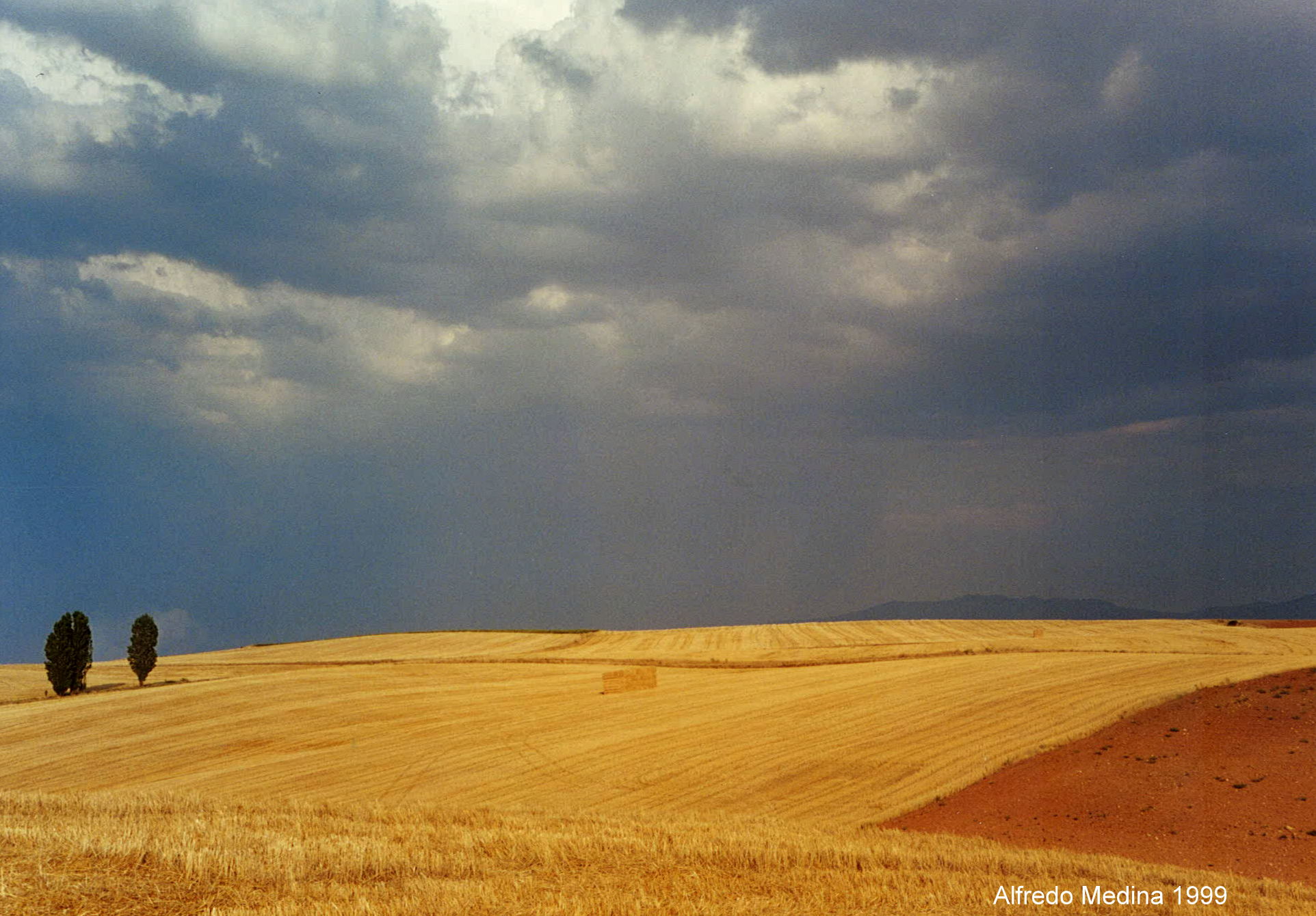 En un viaje por estas tierras al norte del Duero nos topamos continuamente con castillos, iglesias mozárabes y villas amuralladas. En esta comarca se ubican una serie de pequeños pueblos con un patrimonio artístico de gran valor, como Ureña, Torrelobatón o Wamba . Esta última localidad toma este nombre tan peculiar de un rey visigodo, que fue coronado en este pueblo en el año 672. El recorrido por la comarca de Monte Torozos discurre por extensas campos de trigo y cebada, que mutarán de aspecto dependiendo de la estación del año. En verano, los colores dorados predominan en este paisaje ondulante y apacible. Pero al atardecer todo cambia. El cielo se torna violáceo: se aproxima un tormenta. En lo alto de una colina dos olmos viejos y solitarios se siente amenazados.
