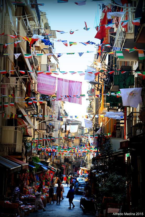 Se suele tener una idea preconcebida de Nápoles como una ciudad caótica y frenética, arquetipo de la vida histriónica del sur y capital mundial de la furbizia, que es esa forma tan napolitana de entender la picaresca. Quizás todo eso sea cierto, pero no se sería justo sino se dijera que Nápoles es mucho más. La antigua Parthenope es un lugar de amplios y desaforados contrastes, donde el arte barroco más sublime prevalece en ese entorno de arraigada degradación . En las calles que rodean Porta Nolana, una de las primitivas entradas a la ciudad, el endemoniado ritmo napolitano alcanza su máxima expresión. En los días laborables se instala aquí un gran mercado callejero, donde el avezado comprador podrá adquirir las mejores gangas. Asistir a las transacciones cotidianas resulta aquí un gran espectáculo. Todo esto sucede en un escenario de calles abigarradas. Aquí la ropa tendida se funde con banderines de fiesta en una atmósfera de aromas a especias y de estruendos de motocicleta.