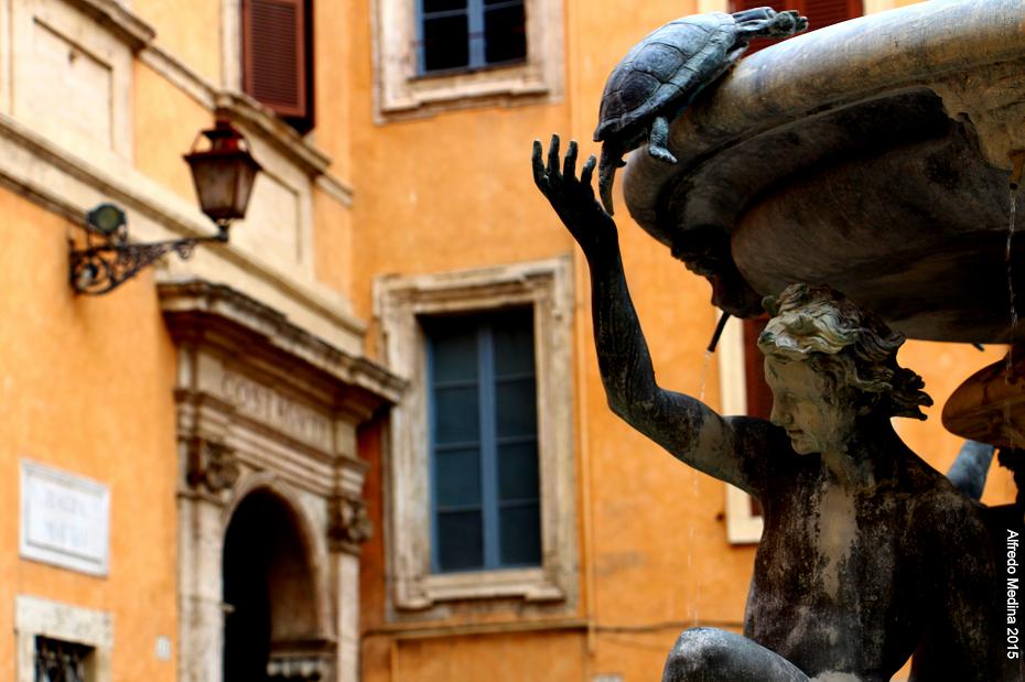 Una pequeña plaza del distrito de Sant’Angelo acoge la considerada por muchos como la fuente más elegante de toda Roma. Construida en el siglo XVI a partir de un proyecto de Giacomo della Porta, la conocida popularmente Fontana delle Tartarughe guarda una curiosa leyenda. El duque Mateii para impresionar a su amada y haciendo ostentación de su poder económico, ordenó construir en una sóla noche una deslumbrante fuente. El resultado fue una armoniosa obra que se estructura en dos grandes cuencos. Cuatro efebos, encaramados sobre delfines, sostienen con delicadeza la parte superior. Para rematar la ornamentación se colocaron otras cuatro tortugas que con el paso del tiempo se han convertido en pintorescos iconos de la vecchia Roma.